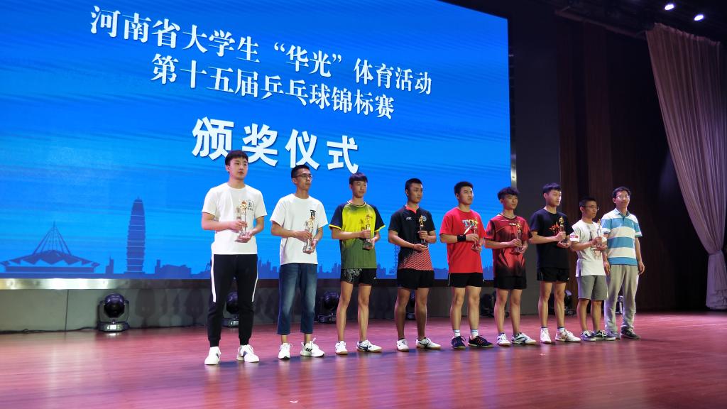 2019年5月13日至5月19日,河南省高等学校第十五届乒乓球锦标赛在河南师范大学新联学院郑州校区举行。我校男子代表队在领队王朝霞、教练员张金锋、孙艳忠的带领下参加了本次比赛。成绩如下: